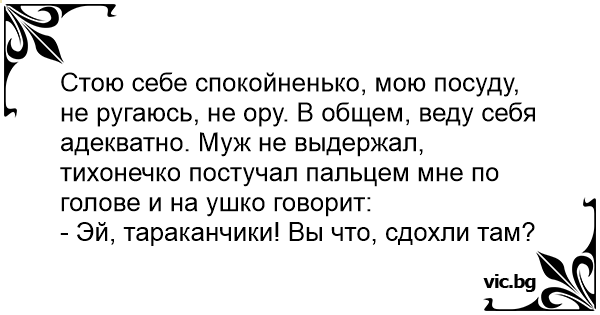 Стою себе спокойненько, мою посуду, не ругаюсь, не ору. В общем, веду себя адекватно. Муж не выдержал, тихонечко постучал пальцем мне по голове и на ушко говорит: