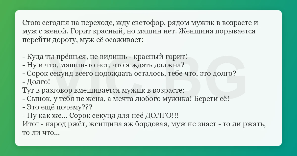 - Куда ты прёшься, не видишь - красный горит! - Ну и что, машин-то нет, что я ждать должна? - Сорок секунд всего подождать осталось, тебе что, это долго? - Долго! Тут в разговор вмешивается мужик в возрасте: - Сынок, у тебя не жена, а мечта любого мужика! Береги её! - Это ещё почему??? - Ну как же... Сорок секунд для неё ДОЛГО!!! Итог - народ ржёт, женщина аж бордовая, муж не знает - то ли ржать, то ли что...