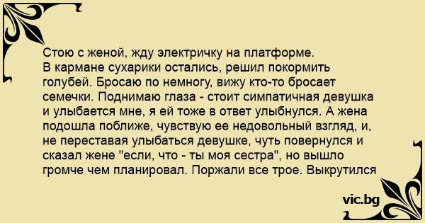 В кармане сухарики остались, решил покормить голубей. Бросаю по немногу, вижу кто-то бросает семечки. Поднимаю глаза - стоит симпатичная девушка и улыбается мне, я ей тоже в ответ улыбнулся. А жена подошла поближе, чувствую ее недовольный взгляд, и, не переставая улыбаться девушке, чуть повернулся и сказал жене "если, что - ты моя сестра", но вышло громче чем планировал. Поржали все трое. Выкрутился