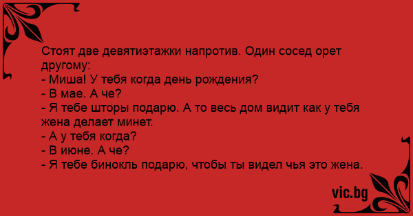 Стоят две девятиэтажки напротив. Один сосед орет другому: