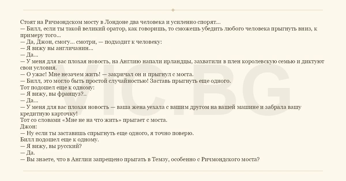 Стоят на Ричмондском мосту в Лондоне два человека и усиленно спорят...