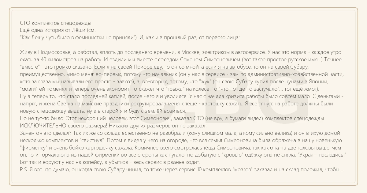 Но не тут-то было. Этот нехороший человек, этот Симеонович, заказал СТО (не вру, я бумаги видел) комплектов спецодежды ИСКЛЮЧИТЕЛЬНО своего размера! Никаких других размеров он не заказал!