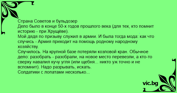 Страна Советов и бульдозер Дело было в конце 50-х годов прошлого века (для тех, кто помнит историю - при Хрущёве). Мой дядя по призыву служил в армии. И была тогда мода: как что случись - Армия приходит на помощь родному народному хозяйству. Случилось. На крупной базе потеряли козловой кран. Обычное дело: разобрать - разобрали, на новое место перевезли, а кто-то сверху навалил кучу угля (или щебня... никто уж точно и не вспомнит). Надо разрывать, искать. Солдатики с лопатами несколько дней рыли, в угле не нашли, так металоискателем проверили и в землю зарылись пока не звякнул металл. Ура! Примчалось начальство, сапёры роют. Только нашли не кран, а бульдозер. У зав. склада спрашивают: "Числится бульдозер? Чо, нет? Ребята, зарывайте! Дальше пойдём искать! К северо-востоку ещё металл звенел..." Что, мораль? Страна без хозяина, что нищий с дырявыми карманами... Впрочем я об этом, кажется, уже не раз писал...