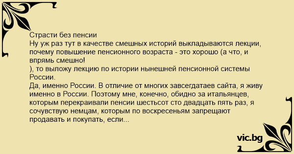 Страсти без пенсии Ну уж раз тут в качестве смешных историй выкладываются лекции, почему повышение пенсионного возраста - это хорошо (а что, и впрямь смешно!