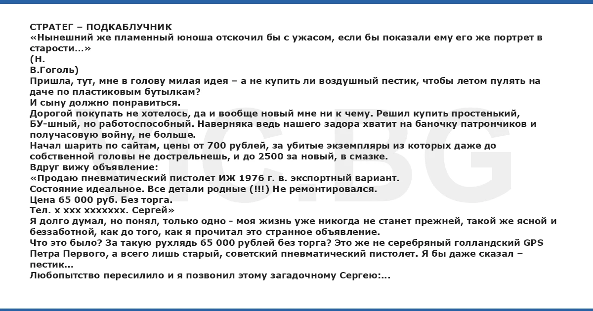 СТРАТЕГ – ПОДКАБЛУЧНИК «Нынешний же пламенный юноша отскочил бы с ужасом, если бы показали ему его же портрет в старости…» (Н. В.Гоголь) Пришла, тут, мне в голову милая идея – а не купить ли воздушный пестик, чтобы летом пулять на даче по пластиковым бутылкам? И сыну должно понравиться. Дорогой покупать не хотелось, да и вообще новый мне ни к чему. Решил купить простенький, БУ-шный, но работоспособный. Наверняка ведь нашего задора хватит на баночку патрончиков и получасовую войну, не больше. Начал шарить по сайтам, цены от 700 рублей, за убитые экземпляры из которых даже до собственной головы не дострельнешь, и до 2500 за новый, в смазке. Вдруг вижу объявление: «Продаю пневматический пистолет ИЖ 1976 г. в. экспортный вариант. Состояние идеальное. Все детали родные (!!!) Не ремонтировался. Цена 65 000 руб. Без торга. Тел. х ххх ххххххх. Сергей» Я долго думал, но понял, только одно - моя жизнь уже никогда не станет прежней, такой же ясной и беззаботной, как до того, как я прочитал это странное объявление. Что это было? За такую рухлядь 65 000 рублей без торга? Это же не серебряный голландский GPS Петра Первого, а всего лишь старый, советский пневматический пистолет. Я бы даже сказал – пестик… Любопытство пересилило и я позвонил этому загадочному Сергею: - Э… Сергей? Добрый день, я по объявлению, по поводу пневматического пистолета ИЖ. Мужской голос в трубке весело рассмеялся: - Да, это мое объявление. Просто аншлаг, за последний час вы уже второй. Что, хотите приобрести? - Если честно, то хотелось бы узнать подробности: из него Пушкина застрелили, что ли? - Ха, нет, не Пушкина, все гораздо проще. Вы женаты? - Да, а что? - Тогда вы меня поймете и не осудите. Тут такая фигня, ну, в общем, я давно хотел себе купить пневматическую винтовку «Вальтер», так, для души, по пивным банкам пулять. Только винтовка эта не простая, а очень не простая. Сорок пять тысяч стоит – ружейная сталь, оптика, сошки, все дела. Но если я заикнусь об этом жене, то она мне голову откусит. Скажет: - «Сережа, ты с ума-то не сходи! Забудь! За сорок пять тысяч можно шубу мне купить, или новую стиральную машину!» Вот поэтому я даже и не заикался. Ну, вот, накопил я потихоньку заначку - 65 тысяч и вчера разместил это объявление, подожду пару дней, подсуну жене, чтобы увидела, а там и прикрою лавочку. Этот пистолет отец еще в детстве мне подарил, так, что вроде как жена идет мимо него. Теперь вот, кхе – кхе, «продам» свой раритет, куплю винтовку и даже «сдача» для жены останется, чтобы не сильно нервничала. Что, тяжко живется нам подкаблучникам? А что делать? Люблю я ее… мою хорошую. А кстати, может пистолет у меня заберете? За тысячу уступлю, да хоть и за пятьсот, все равно, а то жена, если найдет, она же меня из "Вальтера" пристрелит и с дерьмом съест… …Делать нечего, в выходные поеду, куплю, спасу человека от такой изощренной и позорной смерти, к тому же и пестик вроде ничего - не битый, не крашеный и хозяин один…