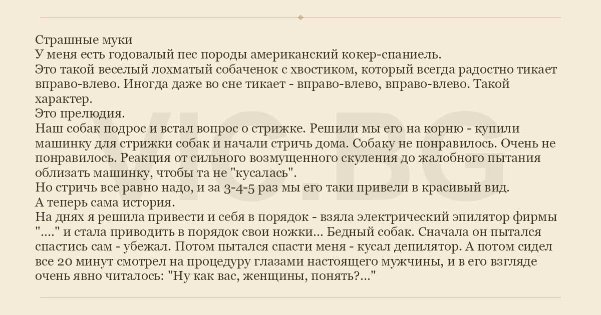 Страшные муки У меня есть годовалый пес породы американский кокер-спаниель. Это такой веселый лохматый собаченок с хвостиком, который всегда радостно тикает вправо-влево. Иногда даже во сне тикает - вправо-влево, вправо-влево. Такой характер. Это прелюдия. Наш собак подрос и встал вопрос о стрижке. Решили мы его на корню - купили машинку для стрижки собак и начали стричь дома. Собаку не понравилось. Очень не понравилось. Реакция от сильного возмущенного скуления до жалобного пытания облизать машинку, чтобы та не "кусалась". Но стричь все равно надо, и за 3-4-5 раз мы его таки привели в красивый вид. А теперь сама история. На днях я решила привести и себя в порядок - взяла электрический эпилятор фирмы "...." и стала приводить в порядок свои ножки... Бедный собак. Сначала он пытался спастись сам - убежал. Потом пытался спасти меня - кусал депилятор. А потом сидел все 20 минут смотрел на процедуру глазами настоящего мужчины, и в его взгляде очень явно читалось: "Ну как вас, женщины, понять?..."
