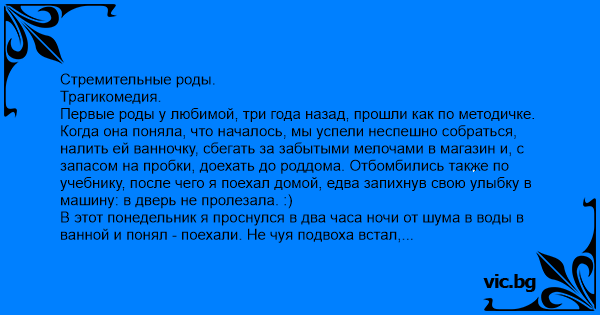 Первые роды у любимой, три года назад, прошли как по методичке. Когда она поняла, что началось, мы успели неспешно собраться, налить ей ванночку, сбегать за забытыми мелочами в магазин и, с запасом на пробки, доехать до роддома. Отбомбились также по учебнику, после чего я поехал домой, едва запихнув свою улыбку в машину: в дверь не пролезала. :)