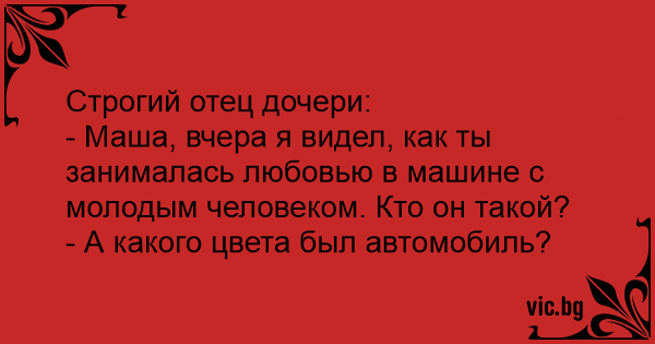 Суворий тато — своїй дочці: — Тетяно, вчора я бачив, як ти цілувалася з якимось хлопцем в автомобілі. Хто він такий? — А якого кольору був автомобіль?