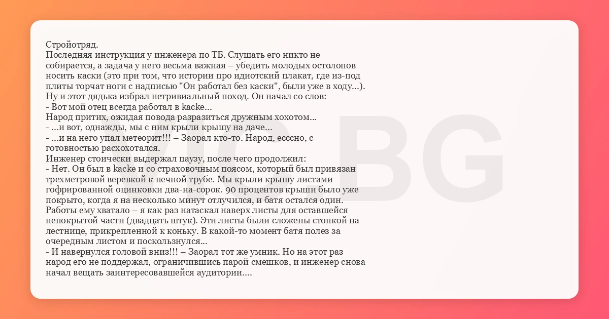 Стройотряд. Последняя инструкция у инженера по ТБ. Слушать его никто не собирается, а задача у него весьма важная – убедить молодых остолопов носить каски (это при том, что истории про идиотский плакат, где из-под плиты торчат ноги с надписью "Он работал без каски", были уже в ходу...). Ну и этот дядька избрал нетривиальный поход. Он начал со слов: - Вот мой отец всегда работал в kacke... Народ притих, ожидая повода разразиться дружным хохотом... - ...и вот, однажды, мы с ним крыли крышу на даче... - ...и на него упал метеорит!!! – Заорал кто-то. Народ, есссно, с готовностью расхохотался. Инженер стоически выдержал паузу, после чего продолжил: - Нет. Он был в kacke и со страховочным поясом, который был привязан трехметровой веревкой к печной трубе. Мы крыли крышу листами гофрированной оцинковки два-на-сорок. 90 процентов крыши было уже покрыто, когда я на несколько минут отлучился, и батя остался один. Работы ему хватало – я как раз натаскал наверх листы для оставшейся непокрытой части (двадцать штук). Эти листы были сложены стопкой на лестнице, прикрепленной к коньку. В какой-то момент батя полез за очередным листом и поскользнулся... - И навернулся головой вниз!!! – Заорал тот же умник. Но на этот раз народ его не поддержал, ограничившись парой смешков, и инженер снова начал вещать заинтересовавшейся аудитории. - Отец соскользнул с крыши и повис под желобом. Надо сказать, что висеть на страховочном поясе неудобно и больно, но у него и в мыслях не было звать на помощь – он был слишком горд для этого. Отец попросту взялся за веревку двумя руками и, с силой потянув, постарался в прыжке дотянуться до края лестницы, лежавшей на скате. Это ему удалось... с большим трудом, потому что в последний момент веревка резко ослабла. Повиснув на краю лестницы, отец мог видеть, что послужило этому причиной: кладка трубы не выдержала рывка, и несколько десятков сцепленных раствором кирпичей, качнувшись, упали на скат, покрытый свежей оцинковкой... И поехали... Прямо на батю... - Ясно! Его шарахнуло по башке трубой!!! – Снова подал голос шутник. Но на этот раз не было даже смешков. - Кажется, я знаю, кого назначить кашеваром на время вашей смены. – Невозмутимо продолжил инженер. – Так вот, батя моментально оценил грозящую ему опасность. Если бы он остался висеть, труба, падая, сбросила бы его вниз прямо на себя (высота стены была больше длины веревки), и поэтому он отпустил лестницу и стал медленно спускаться вниз, вися на веревке. Самообладание стало ему изменять... Я стоял перед кухонным окном, когда увидел, как батя, словно паук, спустился сверху и завис передо мной, дико вращая глазами. До земли ему оставалось меньше метра, и в первый момент я подумал, что он надо мною прикалывается... Но когда он посмотрел наверх и завращал глазами совсем уж дико, я побежал на улицу... Огибая угол дома я услышал жуткий грохот, а когда обогнул, то увидел как батя, сделав два быстрых шага, упал на колени и, проехав полтора метра на них а-ля певец Леонтьев, УШЕЛ ПО ПОЯС В ЗЕМЛЮ!!! Глаза и цвет лица у него при этом были такими, как будто он пытался выкакать что-то очень большое и твердое... - Его черти в ад потащили? – Зло рявкнул новоявленный кашевар, но на него тут же зашикали товарищи. - Нет. – Во выдержка у инженера! – Дело в том, что труба ненадолго зацепилась за желоб на краю крыши (поэтому батя и завис перед окном), а пока я 