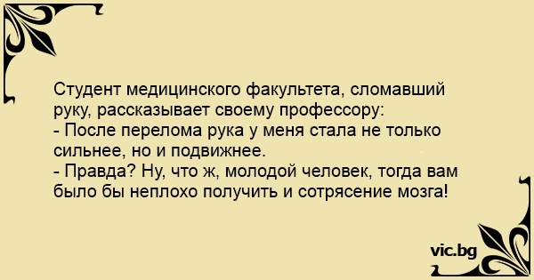 Студент медицинского факультета, сломавший руку, рассказывает своему профессору: