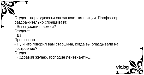 Der Student erscheint zu spät zur Vorlesung. Der Professor pflaumt ihn darauf hin an. "Haben Sie gedient?" "Habe ich!" "Und was hat Ihr Spieß gesagt, wenn Sie zu spät gekommen sind?" "Guten Morgen,...