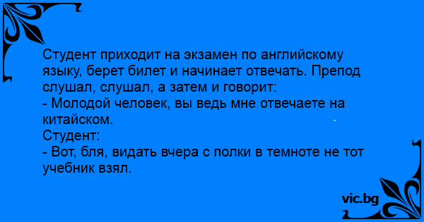 Студент приходит на экзамен по английскому языку, берет билет и начинает отвечать. Препод слушал, слушал, а затем и говорит: