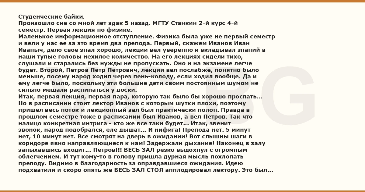 Студенческие байки. Произошло сие со мной лет эдак 5 назад. МГТУ Станкин 2-й курс 4-й семестр. Первая лекция по физике. Маленькое информационное отступление. Физика была уже не первый семестр и вели у нас ее за это время два препода. Первый, скажем Иванов Иван Иваныч, дело свое знал хорошо, лекции вел уверенно и вкладывал знаний в наши тупые головы нехилое количество. На его лекциях сидели тихо, слушали и старались без нужды не пропускать. Оно и на экзамене легче будет. Второй, Петров Петр Петрович, лекции вел послабже, понятно было меньше, посему народ ходил через пень-колоду, если ходил вообще. Да и ему легче было, поскольку эти большие дети своим постоянным шумом не сильно мешали распинаться у доски. Итак, первая лекция, первая пара, которую так было бы хорошо проспать... Но в расписании стоит лектор Иванов с которым шутки плохи, поэтому пришел весь поток и лекционный зал был практически полон. Правда в прошлом семестре тоже в расписании был Иванов, а вел Петров. Так что налицо конкретная интрига - кто же все таки будет... Итак, звенит звонок, народ подобрался, еле дышат... И нифига! Препода нет. 5 минут нет, 10 минут нет. Все смотрят на дверь в ожидании! Вот слышны шаги в коридоре явно направляющиеся к нам! Задержали дыхание! Наконец в залу запыхавшись входит... Петров!!! ВЕСЬ ЗАЛ резко выдохнул с огромным облегчением. И тут кому-то в голову пришла дурная мысль похлопать преподу. Видимо в благодарность за оправдавшиеся ожидания. Идею подхватили и скоро опять же ВЕСЬ ЗАЛ СТОЯ апплодировал лектору. Это был звездный час Петра Петровича. Он стоял, ошарашенный и растроганный таким всеобщим проявлением любви студентов и ждал, когда же они закончат чтобы все таки начать лекцию... Я уж не знаю что он там себе надумал по поводу наших восторгов, но истинная причина стала ясна уже на второй половине пары, когда в зале осталась дай бог десятая часть народов...