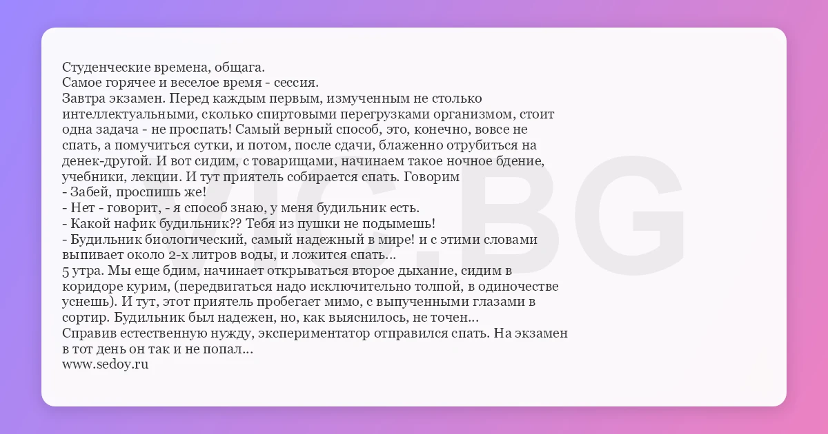 Студенческие времена, общага. Самое горячее и веселое время - сессия. Завтра экзамен. Перед каждым первым, измученным не столько интеллектуальными, сколько спиртовыми перегрузками организмом, стоит одна задача - не проспать! Самый верный способ, это, конечно, вовсе не спать, а помучиться сутки, и потом, после сдачи, блаженно отрубиться на денек-другой. И вот сидим, с товарищами, начинаем такое ночное бдение, учебники, лекции. И тут приятель собирается спать. Говорим - Забей, проспишь же! - Нет - говорит, - я способ знаю, у меня будильник есть. - Какой нафик будильник?? Тебя из пушки не подымешь! - Будильник биологический, самый надежный в мире! и с этими словами выпивает около 2-х литров воды, и ложится спать... 5 утра. Мы еще бдим, начинает открываться второе дыхание, сидим в коридоре курим, (передвигаться надо исключительно толпой, в одиночестве уснешь). И тут, этот приятель пробегает мимо, с выпученными глазами в сортир. Будильник был надежен, но, как выяснилось, не точен... Справив естественную нужду, экспериментатор отправился спать. На экзамен в тот день он так и не попал... www.sedoy.ru
