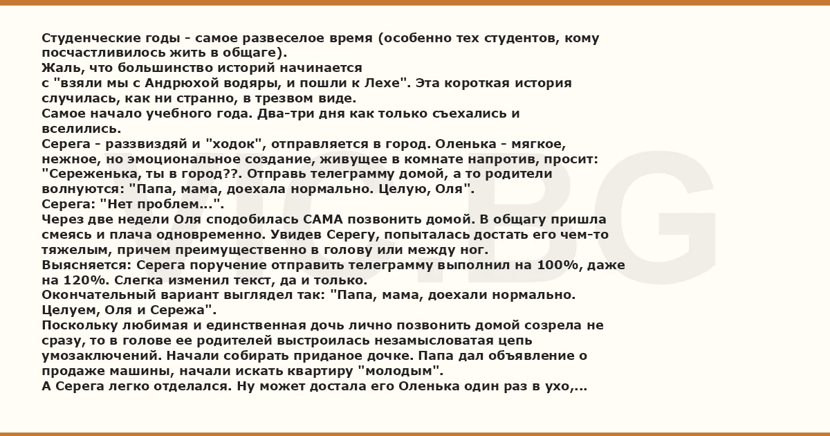 Выясняется: Серега поручение отправить телеграмму выполнил на 100%, даже