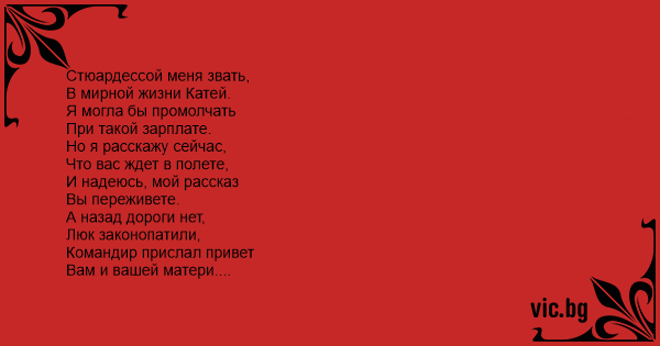 Стюардессой меня звать, В мирной жизни Катей.