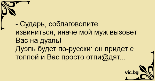 - Сударь, соблаговолите извиниться, иначе мой муж вызовет Вас на дуэль!
