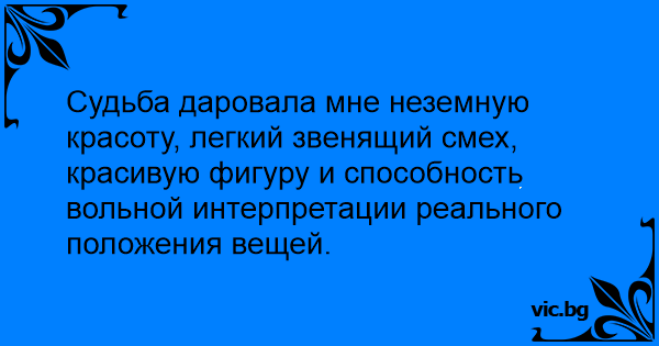 Судьба даровала мне неземную красоту, легкий звенящий смех, красивую фигуру и способность вольной интерпретации реального положения вещей.