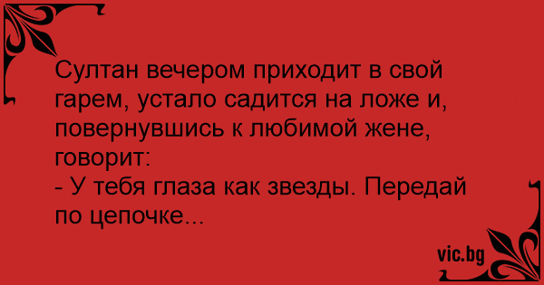 Султан вечером приходит в свой гарем, устало садится на ложе и, повернувшись к любимой жене, говорит: