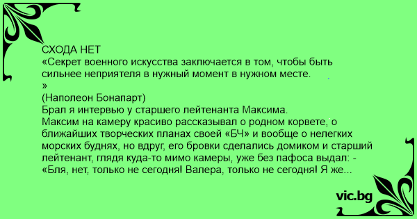 Максим на камеру красиво рассказывал о родном корвете, о ближайших творческих планах своей «БЧ» и вообще о нелегких морских буднях, но вдруг, его бровки сделались домиком и старший лейтенант, глядя куда-то мимо камеры, уже без пафоса выдал: - «Бля, нет, только не сегодня! Валера, только не сегодня! Я же нахер сопьюсь с твоими бабами!»