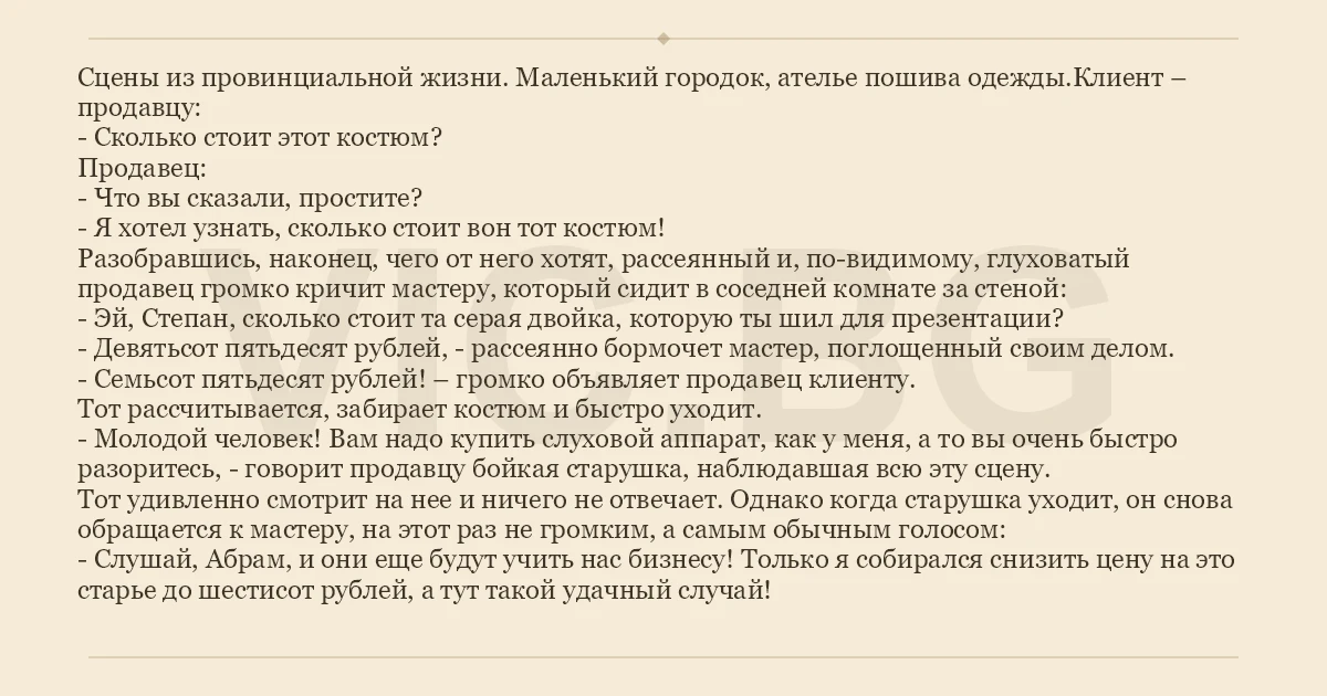 Сцены из провинциальной жизни. Маленький городок, ателье пошива одежды.Клиент – продавцу: