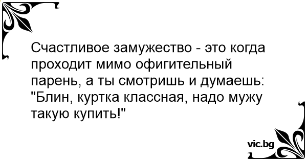 Счастливое замужество - это когда проходит мимо офигительный парень, а ты смотришь и думаешь: "Блин, куртка классная, надо мужу такую купить!"