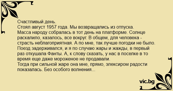 Масса народу собралась в тот день на платформе. Солнце раскалило, казалось, все вокруг. В общем, для человека - страсть неблагоприятная. А по мне, так лучше погодки не было. Поезд задерживался, и я по случаю жары и жажды, в первый раз откушала Фанты. А, к слову сказать, у нас в поселке в то время еще даже мороженое не продавали.