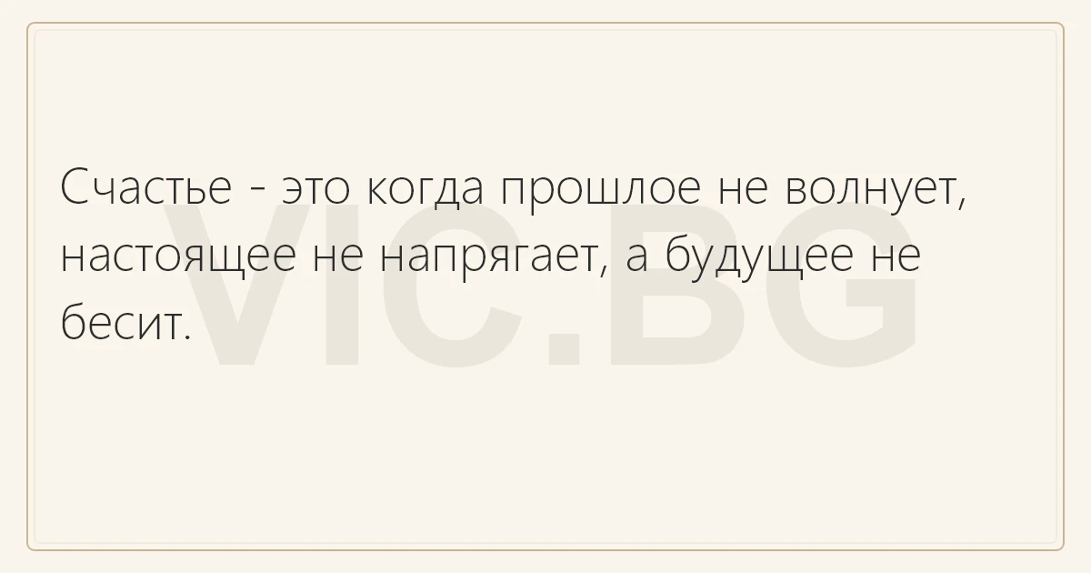 Счастье - это когда прошлое не волнует, настоящее не напрягает, а будущее не бесит.