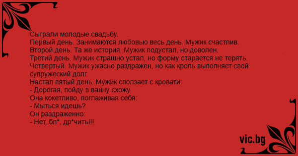 Первый день. Занимаются любовью весь день. Мужик счастлив.