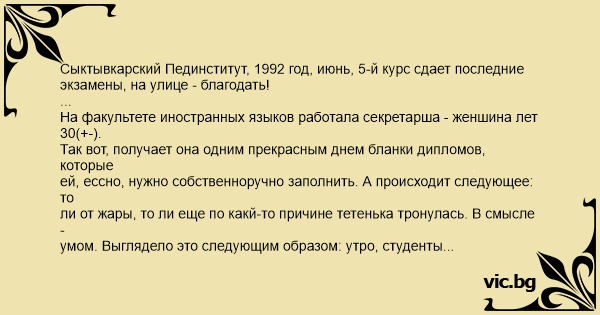 экзамены, на улице - благодать! ... На факультете иностранных языков работала секретарша - женшина лет 30(+-). Так вот, получает она одним прекрасным днем бланки дипломов, которые ей, ессно, нужно собственноручно заполнить. А происходит следующее: то ли от жары, то ли еще по какй-то причине тетенька тронулась. В смысле - умом. Выглядело это следующим образом: утро, студенты торопятся на экзамены (или, по крайней мере, делают вид), поднимаются на второй этаж, а там - секретарша в индийском сари(наряд такой), с точкой на лбу, разумеется (типа, все как у взрослых :), встречает всех и поет "Харе-Кришна, Харе-Харе..." Народ просто в шоке, но улыбаются, ждут развязки. Приходит декан - Гурленов В.М., человек добрый, но не часто улыбающийся. Как реагировать на шоу он не знает, то хмурится, то растерянно смотрит по сторонам, пряча улыбку. В конце концов вызывает скорую. Тетеньку увозят практически под бурные аплодисменты... САмое интересное обнаружилось через некоторое время, когда выпускники, заглянув в свои дипломы, обнаружили, что с легкой руки увезенной мадам они стали... специалистами в области космонавтики! Незаурядное чувство юмора было у тетеньки... Дипломы, конечно же, пришлось уничтожить. А жаль, забавно было бы кому-нибудь показать, похвастаться... А может, даже в ЦУП на работу взяли бы... :))