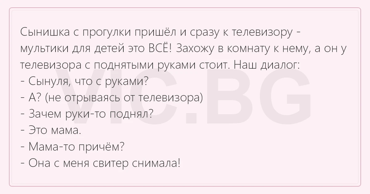 Сынишка с прогулки пришёл и сразу к телевизору - мультики для детей это ВСЁ! Захожу в комнату к нему, а он у телевизора с поднятыми руками стоит. Наш диалог: