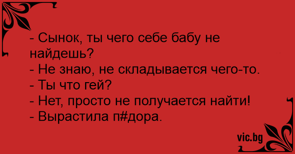 - Сынок, ты чего себе бабу не найдешь?<br />- Не знаю, не складывается чего-то.<br />- Ты что гeй?<br />- Нет, просто не получается найти!<br />- Вырастила п#дора.