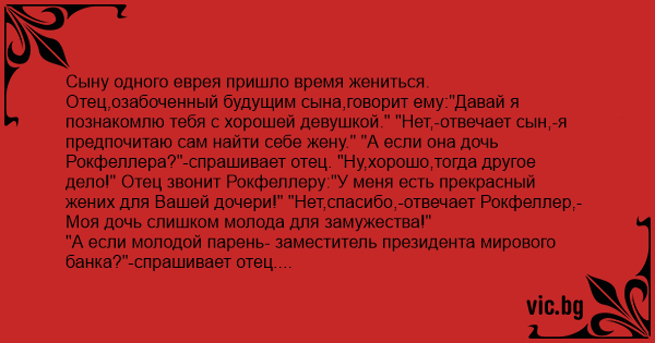 Отец,озабоченный будущим сына,говорит ему:"Давай я познакомлю тебя с хорошей девушкой." "Нет,-отвечает сын,-я предпочитаю сам найти себе жену." "А если она дочь Рокфеллера?"-спрашивает отец. "Ну,хорошо,тогда другое дело!" Отец звонит Рокфеллеру:"У меня есть прекрасный жених для Вашей дочери!" "Нет,спасибо,-отвечает Рокфеллер,-Моя дочь слишком молода для замужества!"