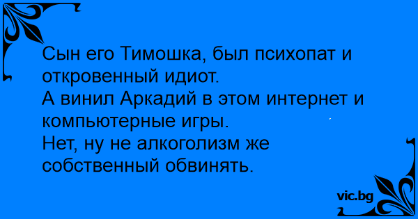 Сын его Тимошка, был психопат и откровенный идиot.<br />А винил Аркадий в этом интернет и компьютерные игры.<br />Нет, ну не алкоголизм же собственный обвинять.
