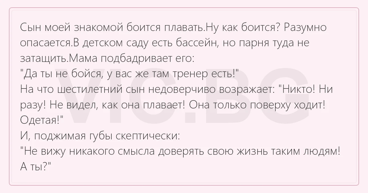 Сын моей знакомой боится плавать.Ну как боится? Разумно опасается.В детском саду есть бассейн, но парня туда не затащить.Мама подбадривает его: "Да ты не бойся, у вас же там тренер есть!" На что шестилетний сын недоверчиво возражает: "Никто! Ни разу! Не видел, как она плавает! Она только поверху ходит! Одетая!" И, поджимая губы скептически: "Не вижу никакого смысла доверять свою жизнь таким людям! А ты?"