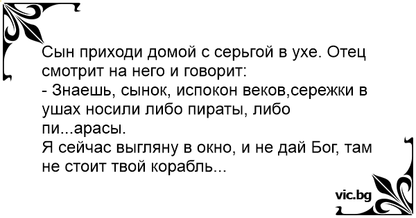 - Знаешь, сынок, испокон веков,сережки в ушах носили либо пираты, либо пи...арасы.