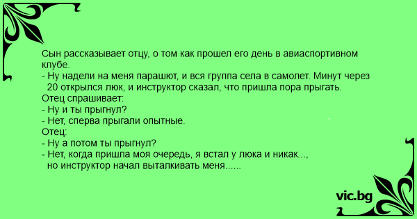 Сын рассказывает отцу, о том как прошел его день в авиaспортивном клубе. - Ну надели на меня парашют, и вся группа села в самолет. Минут через 20 открылся люк, и инструктор сказал, что пришла пора прыгать. Отец спрашивает: - Ну и ты прыгнул? - Нет, сперва прыгали опытные. Отец: - Ну а потом ты прыгнул? - Нет, когда пришла моя очередь, я встал у люка и никак..., но инструктор начал выталкивать меня... Отец: - Ну и тогда ты прыгнул? - Нет, инструктор не смог меня вытолкнуть и позвал пилота на помощь. Пришел огромный и волосатый как горилла пилот, растегнул штаны, вынул гигантский члeн - 40 см в длину и 15 см в диаметре и говорит мне: "Либо ты прыгаешь, либо я тебя прямо здесь трахну". Отец: - Ну и тогда ты прыгнул? - Ага, слегка, в начале...