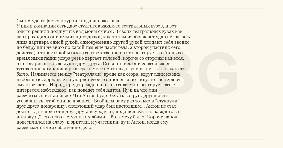 Сын-студент физкультурник недавно рассказал. У них в компании есть двое студентов каких-то театральных вузов, и вот они то решили подшутить над моим сыном. В своих театральных вузах как раз проходили они иммитацию драки, как-то там изображают удар не касаясь лица партнера одной рукой, одновременно другой рукой хлопают себя звонко по бедру или не знаю по какой там еще части тела, а второй участник сего действа(которого якобы бьют) соответственно на это реагирует; то бишь во время иммитации удара резко дергает головой, короче со стороны кажется, что товарисчи вовсю лупят друг друга. Сговорились они со всей своей тусовочной компанией разыграть моего Антошу, глупенькие... И вот как это было. Начинается между "театралами" вроде как ссора, вдруг один из них якобы не выдерживает и ударяет своего оппонента по лицу, тот не теряясь, ему отвечает... Народ, предупрежден и на это совсем не реагирует, все с интересом наблюдают, как поведет себя Антон. Ну и на что они рассчитывали, наивные? Что Антон будет бегать вокруг дерущихся и уговаривать, чтоб они не дрались? Вообщем пару раз только и "стукнули" друг друга понарошку, следующий удар был настоящим... Антон не стал долго ждать пока они друг друга изуродуют, подошел схватил каждого за шкирку и,"легонечко" стукнул их лбами... Вот смеху было! Короче народ повесилился на славу, и зрители, и участники, ну и Антон, когда ему рассказали в чем собственно дело.