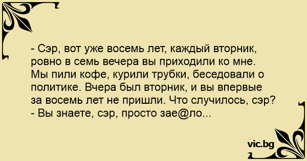 Мы пили кофе, курили трубки, беседовали о политике. Вчера был вторник, и вы впервые за восемь лет не пришли. Что случилось, сэр?