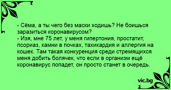 - Изя, мне 75 лет, у меня гипертония, простатит, псориаз, камни в почках, тахикардия и аллергия на кошек. Там такая конкуренция среди стремящихся меня добить болячек, что если в организм ещё коронавирус попадет, он просто станет в очередь.