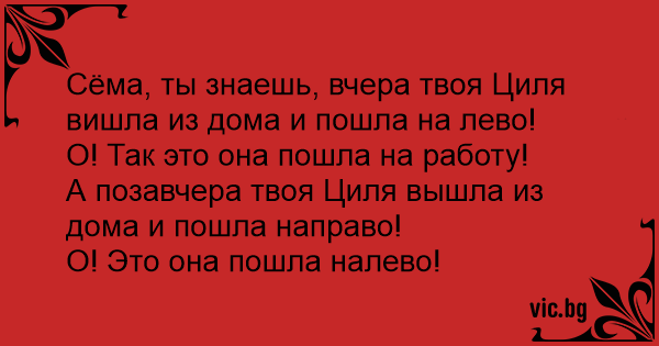 Сёма, ты знаешь, вчера твоя Циля вишла из дома и пошла на лево!