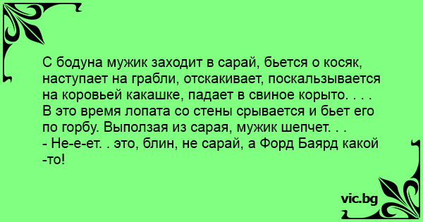 С бодуна мужик заходит в сарай, бьется о косяк, наступает на грабли, отскакивает, поскальзывается на коровьей какашке, падает в свиное корыто. . . .