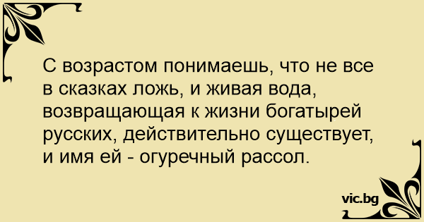 С возрастом понимаешь, что не все в сказках ложь, и живая вода, возвращающая к жизни богатырей русских, действительно существует, и имя ей - огуречный рассол.