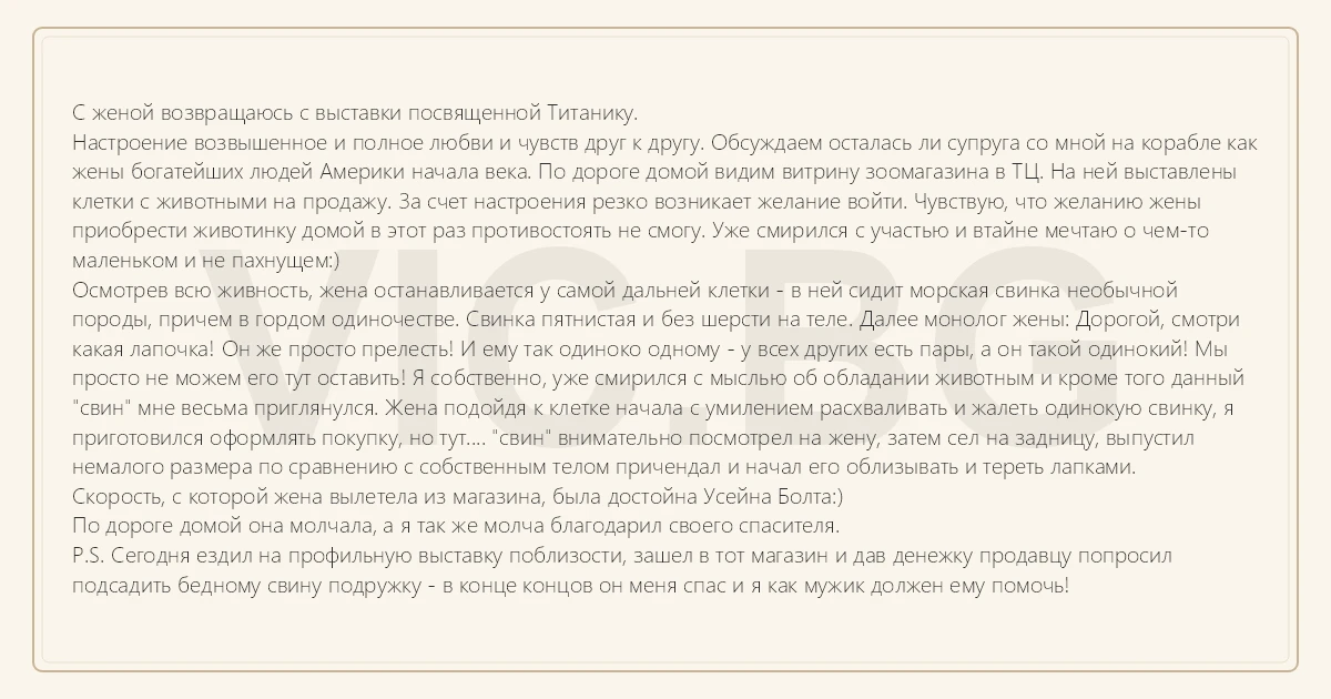 С женой возвращаюсь с выставки посвященной Титанику. Настроение возвышенное и полное любви и чувств друг к другу. Обсуждаем осталась ли супруга со мной на корабле как жены богатейших людей Америки начала века. По дороге домой видим витрину зоомагазина в ТЦ. На ней выставлены клетки с животными на продажу. За счет настроения резко возникает желание войти. Чувствую, что желанию жены приобрести животинку домой в этот раз противостоять не смогу. Уже смирился с участью и втайне мечтаю о чем-то маленьком и не пахнущем:) Осмотрев всю живность, жена останавливается у самой дальней клетки - в ней сидит морская свинка необычной породы, причем в гордом одиночестве. Свинка пятнистая и без шерсти на теле. Далее монолог жены: Дорогой, смотри какая лапочка! Он же просто прелесть! И ему так одиноко одному - у всех других есть пары, а он такой одинокий! Мы просто не можем его тут оставить! Я собственно, уже смирился с мыслью об обладании животным и кроме того данный "свин" мне весьма приглянулся. Жена подойдя к клетке начала с умилением расхваливать и жалеть одинокую свинку, я приготовился оформлять покупку, но тут.... "свин" внимательно посмотрел на жену, затем сел на задницу, выпустил немалого размера по сравнению с собственным телом причендал и начал его облизывать и тереть лапками. Скорость, с которой жена вылетела из магазина, была достойна Усейна Болта:) По дороге домой она молчала, а я так же молча благодарил своего спасителя. P.S. Сегодня ездил на профильную выставку поблизости, зашел в тот магазин и дав денежку продавцу попросил подсадить бедному свину подружку - в конце концов он меня спас и я как мужик должен ему помочь!