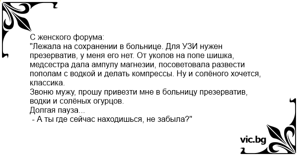 "Лежала на сохранении в больнице. Для УЗИ нужен пpeзepbatиb, у меня его нет. От уколов на попе шишка, медсестра дала ампулу магнезии, посоветовала развести пополам с водкой и делать компрессы. Ну и солёного хочется, классика.