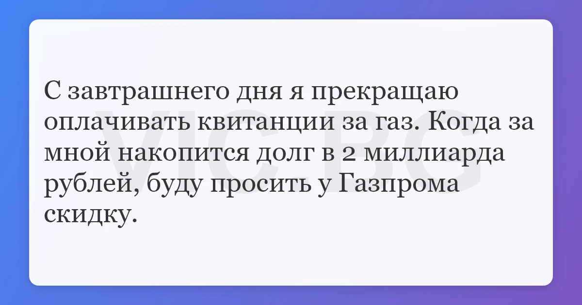 С завтрашнего дня я прекращаю оплачивать квитанции за газ. Когда за мной накопится долг в 2 миллиарда рублей, буду просить у Газпрома скидку.