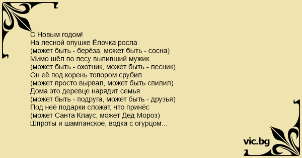 С Новым годом! На лесной опушке Ёлочка росла (может быть - берёза, может быть - сосна) Мимо шёл по лесу выпивший мужик (может быть - охотник, может быть - лесник) Он её под корень топором срубил (может просто вырвал, может быть спилил) Дома это деревце нарядит семья (может быть - подруга, может быть - друзья) Под неё подарки сложат, что принёс (может Санта Клаус, может Дед Мороз) Шпроты и шампанское, водка с огурцом (может с винегретом, может – с холодцом) После третьей рюмки - встанут в хоровод (а без хоровода, что за Новый год?) Будут петь «застольные» - кто не сильно пьян (может под гитару, может под баян) Утром, даже стойкие, все уснут в кровати (может на диване, может быть в салате) А пока вас, суки, просит Дед Мороз Не рубите ёлок,… сосен и берёз.