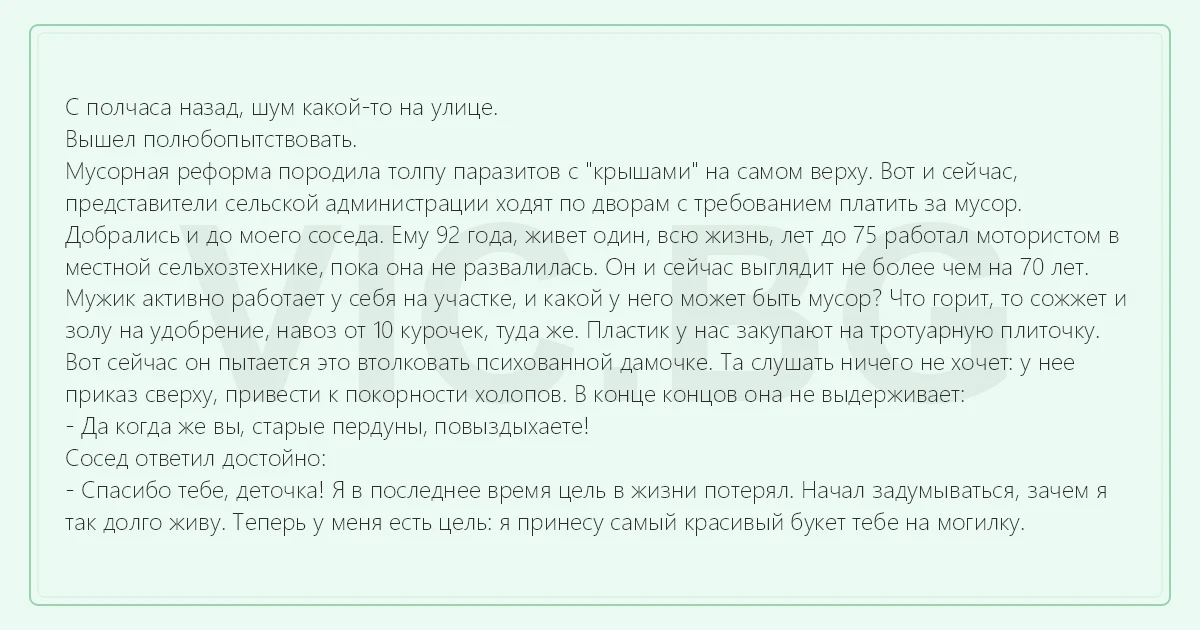 С полчаса назад, шум какой-то на улице. Вышел полюбопытствовать. Мусорная реформа породила толпу паразитов с "крышами" на самом верху. Вот и сейчас, представители сельской администрации ходят по дворам с требованием платить за мусор. Добрались и до моего соседа. Ему 92 года, живет один, всю жизнь, лет до 75 работал мотористом в местной сельхозтехнике, пока она не развалилась. Он и сейчас выглядит не более чем на 70 лет. Мужик активно работает у себя на участке, и какой у него может быть мусор? Что горит, то сожжет и золу на удобрение, навоз от 10 курочек, туда же. Пластик у нас закупают на тротуарную плиточку. Вот сейчас он пытается это втолковать психованной дамочке. Та слушать ничего не хочет: у нее приказ сверху, привести к покорности холопов. В конце концов она не выдерживает: - Да когда же вы, старые пердуны, повыздыхаете! Сосед ответил достойно: - Спасибо тебе, деточка! Я в последнее время цель в жизни потерял. Начал задумываться, зачем я так долго живу. Теперь у меня есть цель: я принесу самый красивый букет тебе на могилку.