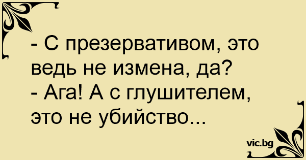 — Мила, адже з презервативом — це не зрада? — Ага, а з глушником — не вбивство...