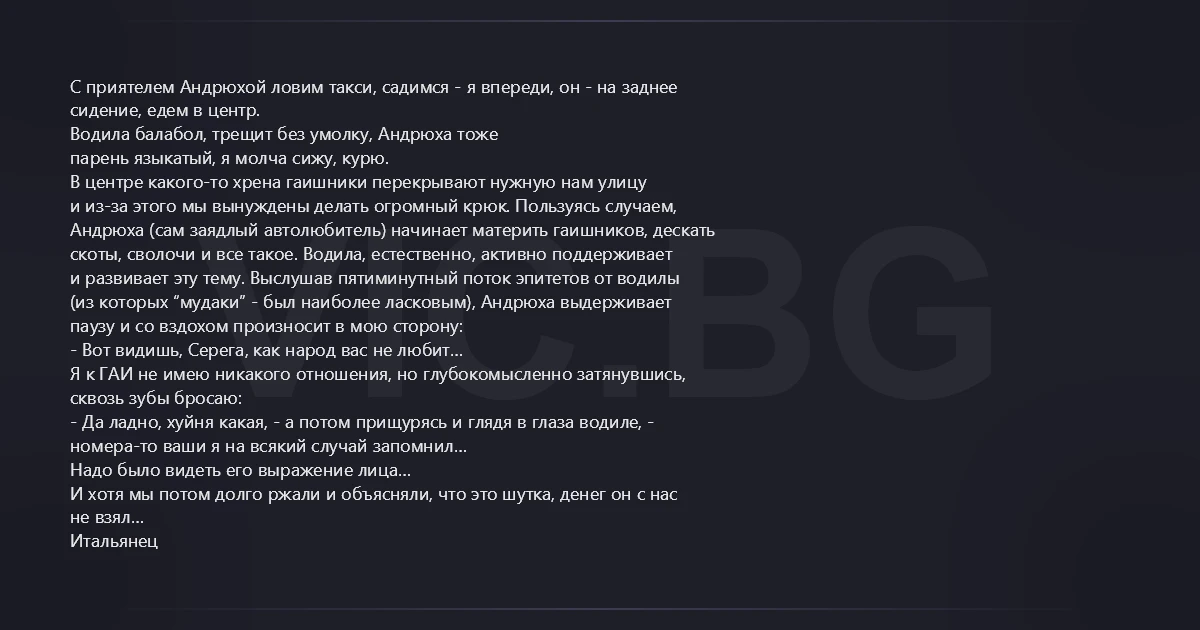 и развивает эту тему. Выслушав пятиминутный поток эпитетов от водилы